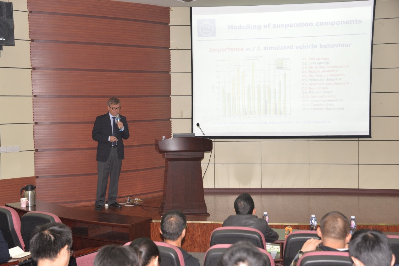 镜湖宾馆多功能大厅, Mats Berg教授进行了第一场学术讲座,讲座由实验室赵春发教授主持。Mats Berg教授首先对其所在的团队进行了详细的介绍,并鼓励有兴趣的同学到KTH攻读博士学位。随后Mats Berg教授对车辆—轨道作用的动态仿真中要注意的问题进行了讲解,结合一系悬挂、二系悬挂元件的建模,讲述了最基本的建模原则和如何对模型进行分析。讲座结束后,Mats Berg教授对同学们提出的仿真中遇到的实际问题做了详细的解答。