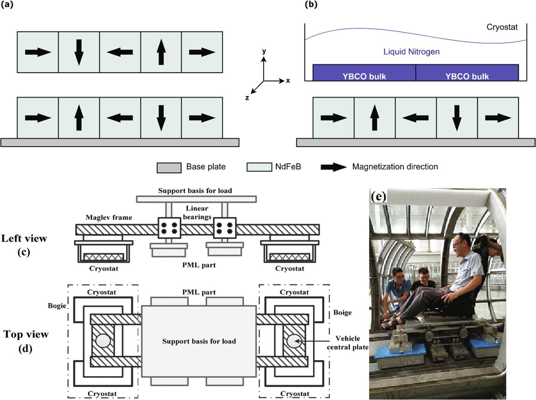 Fig. 1. Diagrams of the hybrid maglev system composed of (a) the PML part and (b) the SML part; diagrams of the vehicle body from (c) left view and (d) top view; (e) photo of the manned hybrid maglev vehicle with one passenger.
